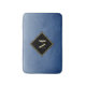 Capture a atenção com este tapete elegante e na moda azul e preto de monograma. Este design simples e sofisticado de gradiente escovado com uma estrutura moderna em forma de diamante com uma borda dourada pode ser personalizado adicionando seu primeiro monograma. Imagem em formato plano, NÃO metálica.