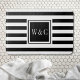 Um tapete monográfico de iniciais personalizadas elegantes, com um padrão listrado preto e branco, com as suas iniciais num quadrado bordado preto, com um texto branco clássico. Projetado por Thisnotme©