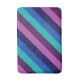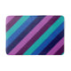 Um tapete de banho de tamanho médio com um padrão colorido de faixas diagonais em legal tom, azul-oceano, azul-marinho, roxo de ameixa e lavanda.