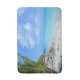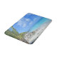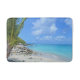 A bath mat with a scenic tropical photograph. A secluded beach with white sand and turquoise water.