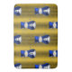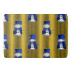 Um padrão de Natal bonito e colorido com neve vestida de chapéu de veludo azul e coletes, sobre um fundo festivo de ouro com estrelas de ouro para adicionar um toque na moda e caprichoso às suas decorações natalinas este ano.