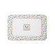 Bolas de Natal bonitas e padrão de presentes, tapete de banho monograma. Mostra uma fronteira de presentes e ornamentos de Natal e seu monograma em branco.