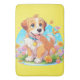 Um tapete de banho com uma fotografia de um filhote fofo sentado entre as flores. Ele parece muito feliz por estar cercado por flores e borboletas. O presente perfeito para dar àqueles que amam cachorros. Contém conteúdo generativo.