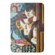 O gato Calico brincando com um dragão chinês vermelho em frente a uma janela de vidro colorido de pavão.