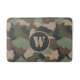 Decorre seu banheiro em estilo com este tapete de banho de camuflagem personalizado. Este padrão de camo tradicional da floresta inclui cores em khaki, verde-sábio, bronzeado, castanho e carvão preto com seu monograma inicial em tipografia de stencil bronzeado para você personalizar. O presente perfeito para a família e amigos que estão na camuflagem militar ou amorosa. Desenhado pela artista ©Susan Coffey.