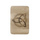 Um tapete de banho com um triquetra celta de cor simples entrelaçado com um círculo formando um símbolo trinitário contra um fundo de madeira, representando a união espiritual com o divino.