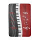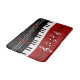 Um design legal e atraente da música do piano que caracteriza chaves do piano em um movimento de ondulação no centro com vermelho, contagens preto e branco das notas musicais acima e abaixo nas cores alternas.