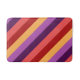 Um tapete de banho de tamanho médio, com um padrão colorido de faixas diagonais em vermelho cereja, rosa melão, violeta, roxo de ameixa e amarelo de banana.