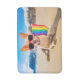 Esta foto fofa mostra um cachorro chihuahua na praia carregando uma bandeira Orgulho gay de cor arco-íris.