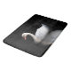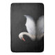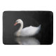 Cisne branco mudo flutuando num lago com reflexo na água contra fundo preto. Chave baixa.