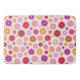 Colorful flower pattern in yellow, orange, pinks, lilac and reds on a cream color background.