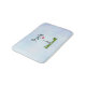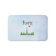 Um tapete de banho com um desenho cômico da Torre Eiffel rodeado por árvores verdes e coração de aquarela rosa flutuando no ar.