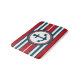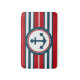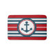 Design náutico com decoração em forma redonda com âncora sobre fundo listrado vermelho, azul e branco