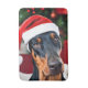 Doberman bonito vestindo um chapéu de Papai Noel.