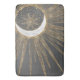 Esta design estética magnífica, mística, solar e lua crescente mandala universo é perfeita para decoração domiciliar, visto cotidiano ou eventos especiais encantados. Um bonito e caprichoso design de sol dourado e mandala da lua, com flores e folhas de rabisco, estrelas, pontos, diamantes, círculos, triângulos e formas geométricas em escala de sereia, com uma lua brilhante palco crescente, uma estrela da flor da mandala, feita com folha de ouro falsa, em uma nebulosa de cinzas escuras, estrelas de galáxias e um fundo gradiente de cinza.