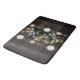 Marcadores e teclas antigas com engrenagens de ouro e latão, decoradas com libélulas mecânicas e boias em fundo castanho e listrado.