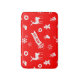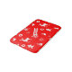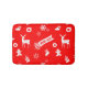 Um tapete de banho com repetições brancas e sem costura de elementos de Natal - meias, gingerbreadman, flocos de neve, renas, Enfeites de natal, velas, árvore de Natal e as palavras "Feliz Natal" - a título ilustrativo, contra um fundo vermelho.