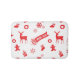 Um tapete de banho com uma repetição contínua vermelha de elementos de Natal - meias, gingerbreadman, flocos de neve, renas, Enfeites de natal, velas, árvore de Natal e as palavras "Feliz Natal" - em ilustração.