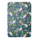 Pelicanos bonitos com flores tropicais coloridas, em um padrão sem costura, com fundo azul. Design perfeito para uma casa de praia.