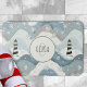 Este adorável tapete náutico personalizado apresenta faróis confortáveis com ondas geladas e flocos de neve.