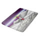 Uma ilustração paisagística do Farol Les Eclaireurs, que se situa no sul da Argentina, o farol e as montanhas são desenhados a preto e branco. O céu noturno tem uma matiz roxa de crepúsculo, e como iluminado pelo farol.