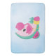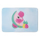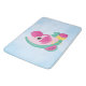 Um tapete de banho com uma ilustração fofinha de um flamingo cor-de-rosa com algumas melancias e abacaxis. Esquema de cor rosa e verde. Sumério e tropical. O fundo é uma imagem de aquarela azul-clara.