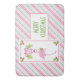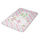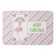 Uma esteira de banho caprichosa de Natal tropical. Um flamingo rosa elegante com uma perna levantada. Usando um chapéu de Papai Noel rosa e alguns azevinhos sazonais. Azevinhos com frutas também decoram os cantos. Uma bouquê floral com bastões de doce acima da cabeça dela. Um fundo listrado de rosa e verde com bastões de doce. Feliz Natal escrito em letras verdes em estilo art déco em negrito.
