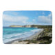Imagem: longa visão de água azul-do-mar aqua se quebrando em areia branca com vistas de penhascos altos e vegetação exuberante