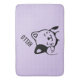 Um banho desenhado com uma ilustração de um gatinho sorridente e balançando com um ponto preto ao redor do ouvido. Fundo bolinhas roxo. Simples e adorável.