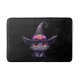 Um tapete de banho com uma ilustração temática divertida do Halloween para amantes de gatos. Um gato preto de olhos grandes vestindo um chapéu de bruxa preta grande com um cinturão roxo rosa ao redor da borda.