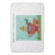 Um banheiro com uma imagem de um adorável gato laranja sentado em uma equipe. Vestindo um chapéu de inverno e cachecol. Flocos de neve caindo em dentro verde-claro. Fundo branco de flocos de neve. O texto diz Meowy Christmas.