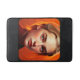 A girl with blue eyes on an orange background, dark black and crimson, photorealistic fantasies, personal iconography, detailed character design, shiny/glossy