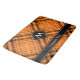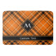 Amostra moderna de tartã laranja e preto de halloween. Texto personalizado e monograma.