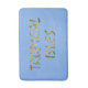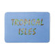 Mosaico, texto gráfico, "Isles Tropicais" que significa, uma fantasia fictícia, mostrada num padrão exótico, insular de; laranja, verde-oliva, amarelo, esticado, marrom, preto e branco.