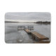 Um tapete de banho com foto de uma doca congelada em um lago congelado.