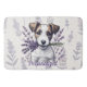 Uma encantadora ilustração feita à mão de um Jack Russell Terrier segurando um timbre de lavanda.