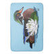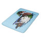 Pato de madeira que corre a água com um lenço de água branco ao lado do pato num pano de fundo azul