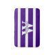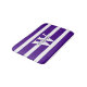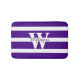 tapete de banho de na moda, feito em um padrão violento roxo e riscado. Um monograma branco e grande personalizado, no meio do tapete, e texto roxo, está pronto para personalizar para si mesmo ou como uma ideia de presente de excelente. Vem em três tamanhos.