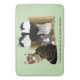Quatro gatos agrupados ao redor de uma caixa de papelão contra um pano de fundo verde