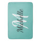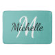 Bath mat com fundo azul claro e monograma personalizado branco primeiro e primeiro nome.