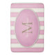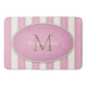 Este tapete de banho personalizado tem um monograma de bronze ou ouro antigo numa moldura oval sobre fundo de tiras largas, de cor-de-rosa e branco antigo.