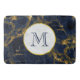 Um tapete com um na moda e fundo elegante de marinho azul e mármore dourado. Camadas sobre o topo é um círculo com uma borda falsa de folha de ouro com o seu dentro inicial de monograma personalizado.