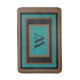 Monograma inicial no centro em tipografia negra. Padrão de blocos geométricos. Verde verde-lacrimogêneo com retângulos castanho e preto. Design original de TamiraZDescartazes.