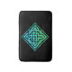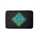 Um tapete de banho de um design de nó celta azul-esverdeado contra um fundo preto.
