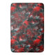 Desenho grosso da arte gráfica em que o vermelho sofre um leve gradiente causando a percepção de algo torcido, especialmente quando contrasta com cinzas brancas e outras peças se chocam com pontos pretos causando uma percepção que lembra a sombra, parecendo partes das 'folhas vermelhas' flutuando ou distantes do chão.
