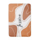 Um tapete de banho marrom, personalizado, com um padrão geométrico moderno e abstrato e um nome personalizado impresso no centro. Cortina de chuveiro correspondente disponível.