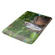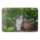 Um gato se senta no jardim verde, próximo a um tronco e olha à frente