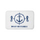 Um belo tapete de banho com seu nome de barco personalizado, nome de família ou outro texto desejado. Apresentando uma âncora náutica e um emblema de cavalo. Marinho azul em branco ou altere facilmente a cor de fundo para corresponder ao seu tema de decoração atual. Disponível em vários tamanhos. Perfeito para sua casa de praia de férias.