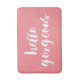 Lembre-se da sua quente cada vez que sair do chá ou do banho. O tapete de banho de coral cor-de-rosa-pêssego apresenta "Hello Gorgeous" em tipografia de bruxos brancos. Use o campo personalização opcional para adicionar um nome, um monograma ou uma mensagem ou sua escolha!