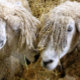 Duas lindas ovelhas Cotswold capturadas fotograficamente em um momento engraçado e humorístico conversando entre si. Os ovinos de coalhada são originários dos Cotswolds, na Inglaterra, e são criados para a sua lã e carne. Eles têm pulgas longas com quase ouro de tonalidade.